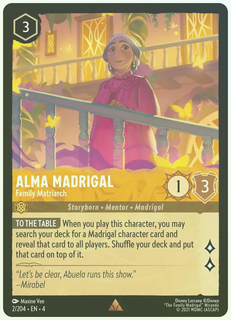 When you play this character, look at your deck. You may reveal a Madrigal character card. Shuffle your deck and put that card on top of your deck.