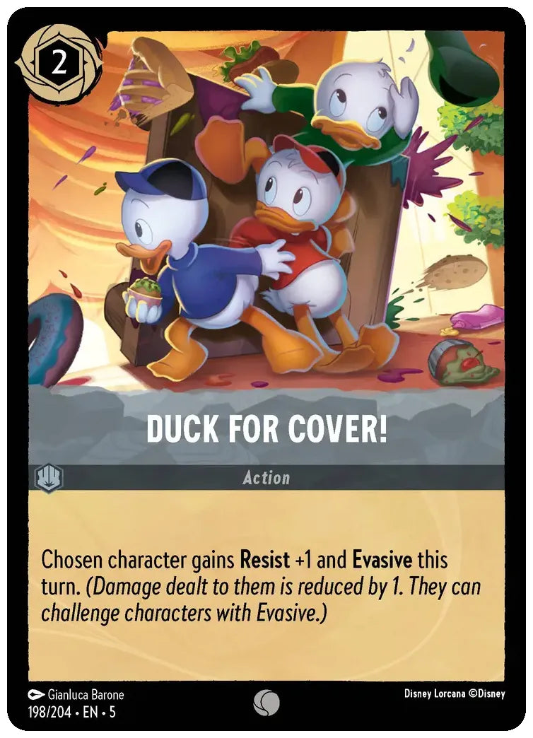 Chosen character gains Resist +1 and Evasive this turn. (Damage dealt to them is reduced by 1. They can challenge characters with Evasive.)