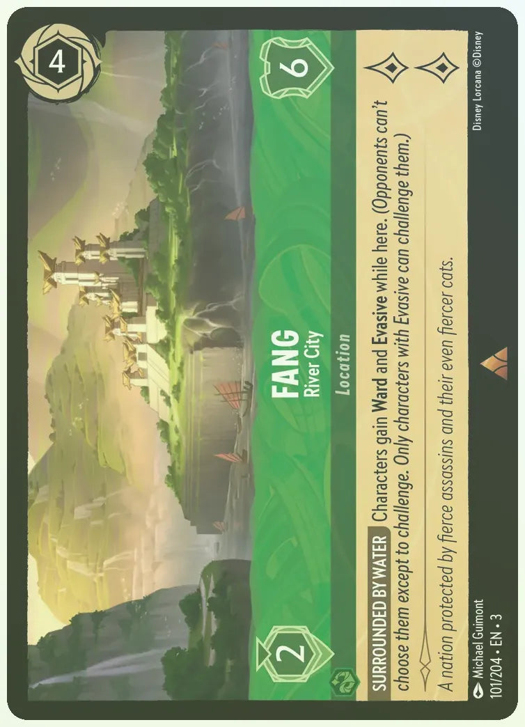 Characters gain Ward and Evasive while here. (Opponents can't choose them except to challenge. Only characters with Evasive can challenge them.)