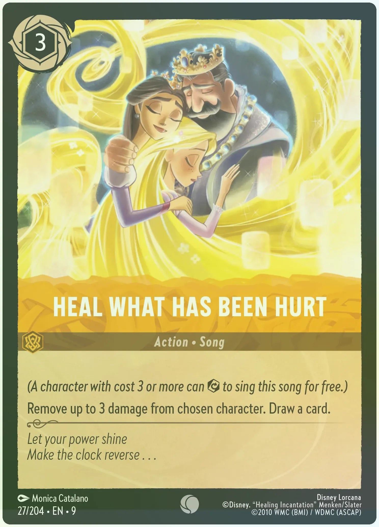 (A character with cost 3 or more can to sing this song for free.) Remove up to 3 damage from chosen character. Draw a card.
