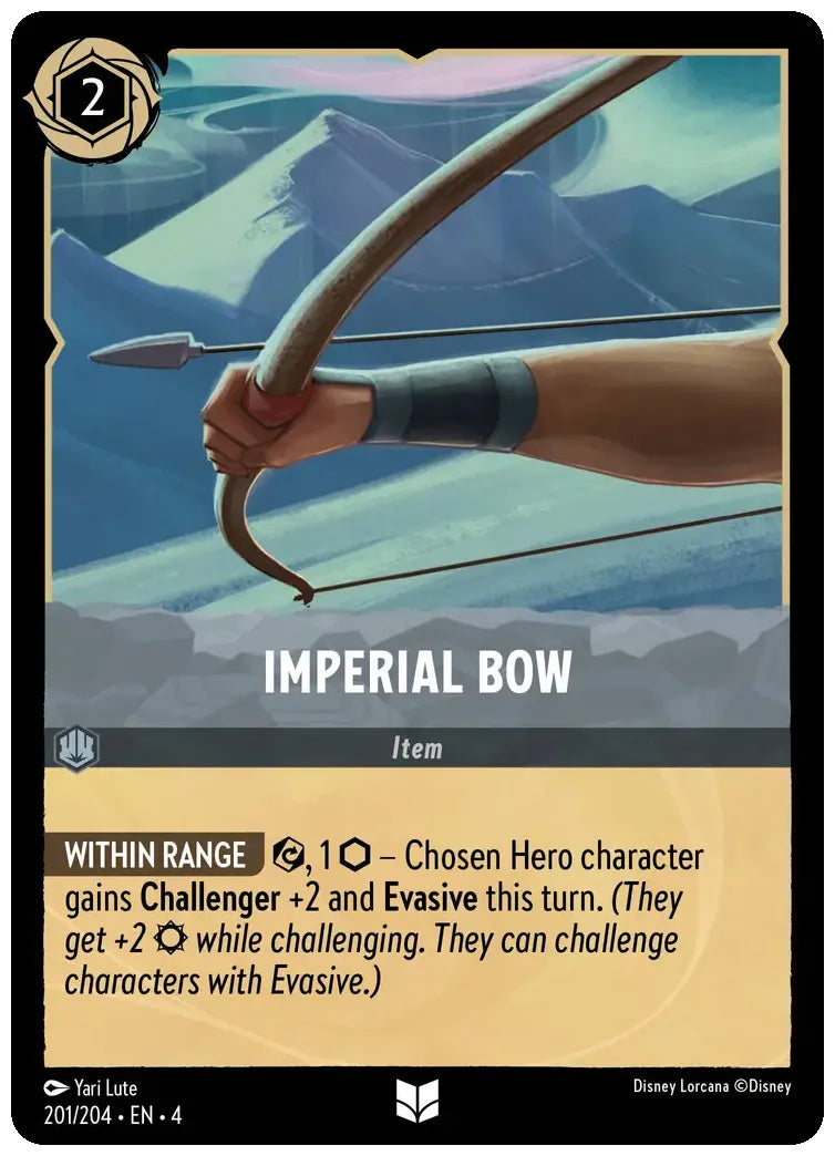 Exert, 1 ink – Chosen Hero character gains Challenger +2 and Evasive this turn. (They get +2 strength while challenging. They can challenge characters with Evasive.)
