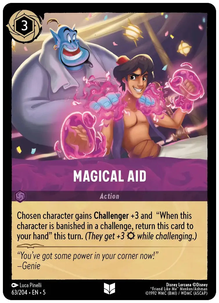Chosen character gains Challenger +3 and "When this character is banished in a challenge, return this card to your hand" this turn. (They get +3 strength while challenging.)