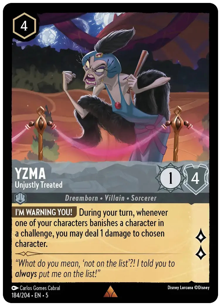During your turn, whenever one of your characters banishes a character in a challenge, you may deal 1 damage to chosen character.