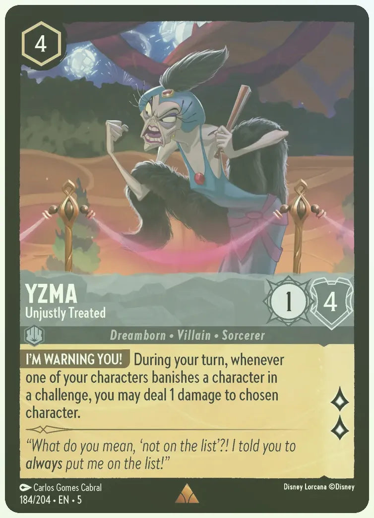 During your turn, whenever one of your characters banishes a character in a challenge, you may deal 1 damage to chosen character.